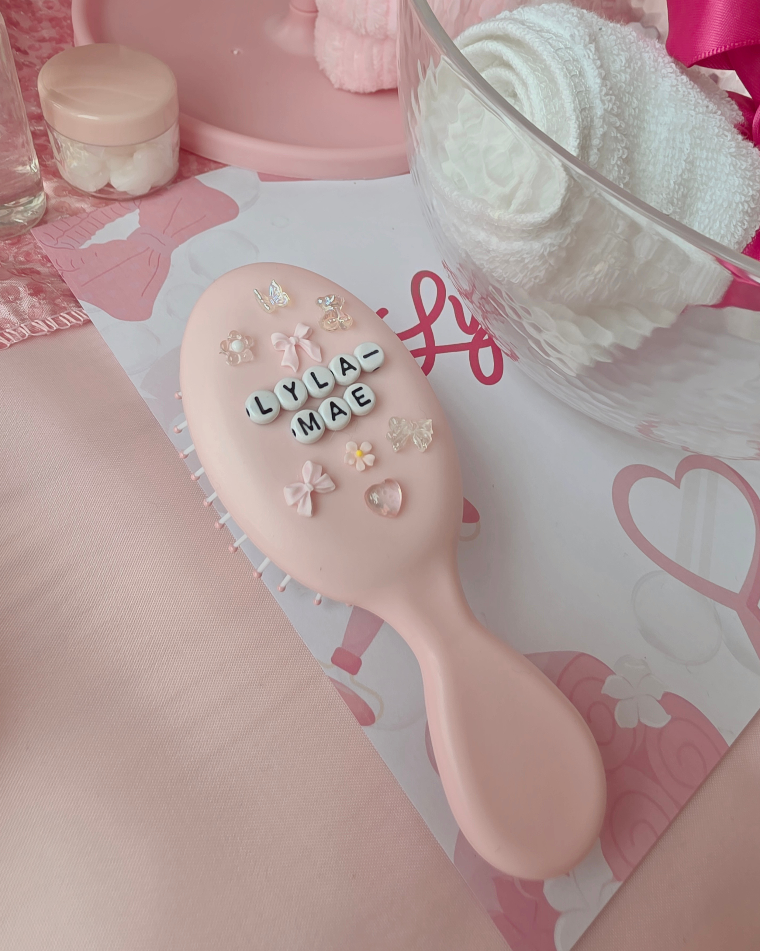 No goody bags needed here — the pampering continues long after the party ends. Guests leave not just with their glitter extensions still shining in their hair, but also with a collection of luxurious keepsakes: a silky spa headband and fluffy wrist cuffs, their very own ice roller, a pretty pink handheld mirror, and a personalised, bejewelled hairbrush — perfect for recreating the pamper experience at home whenever they like. They also receive a cone filled with pretty pink sweets… though we can’t promise it will make it all the way home!