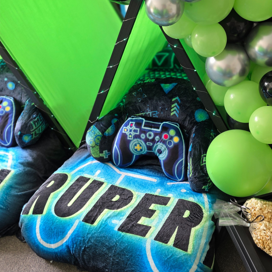 From the moment they walk in, it’s game on. Neon green, blue and black tents glow under the lights, each one marked with a personalised blanket so every guest knows exactly which den is theirs. With their very own chill cushion ready and waiting, they’ll dive straight into the action—settling in, switching on, and getting ready for a night of gaming, board battles and best-mate banter.